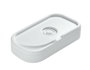 White, rectangular device with rounded corners and a central, circular depression