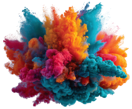 Explosive colorful smoke burst studio digital art vibrant close-up. Isolated on transparent background, png.