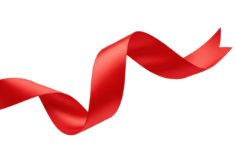 A vibrant red satin ribbon, glossy and smooth, elegantly flowing and curving in a sinuous wavy shape, isolated against a pristine plain white background with diffused studio light and no shadows,