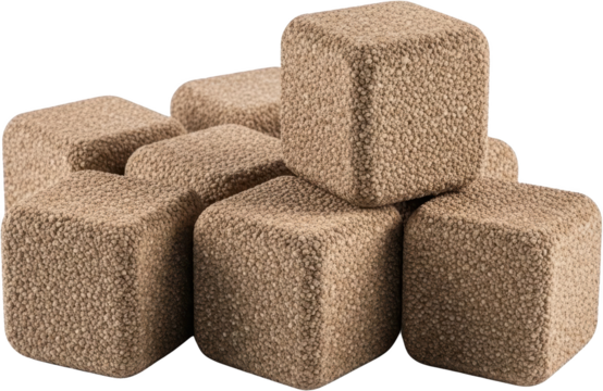 A pile of textured beige cube shaped poufs with rounded edges stacked together isolate Ottoman Fabric Brown Transparent background Furniture Seating Modular