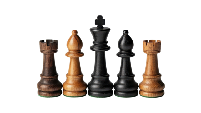 A close-up of wooden chess pieces arranged in a row, showcasing strategic gameplay and classic design.