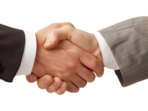 Close-up handshake between two business professionals in black and gray suits symbolizing partnership, agreement, or formal greeting, high-resolution isolated PNG cutout with transparent background