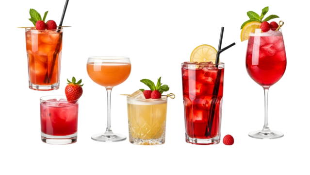 a set of cocktails: gin tonic, blue lagoon, tequila sunrise, iced irish coffee, pina colada, mai tai, cocktail with rum, whiskey, mojito
