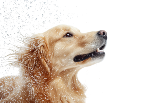 A golden retriever shakes off snowflakes, radiating joy and playfulness against a dark background.