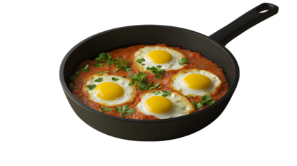 Pan of shakshuka with poached eggs in tomato and pepper sauce, garnished with parsley isolated on transparent background