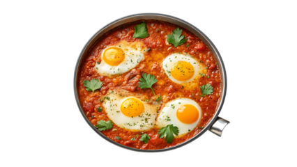 Top down view of shakshuka in a pan, transparent background PNG for food marketing and design