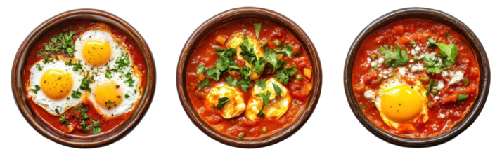 Three varieties of shakshuka with eggs and herbs in ceramic bowls png