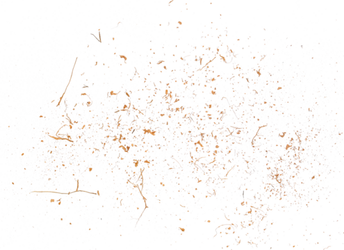 Grated coconut shell, wood pieces, curls and dust flying, crushed bark isolated on white background, organic texture, clipping path