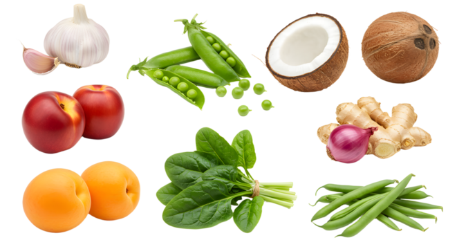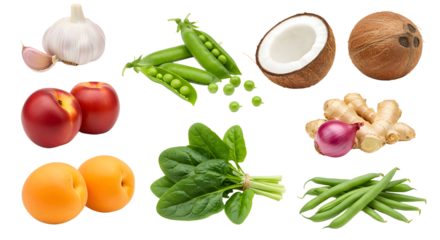 Fresh vegetables and fruits assortment including garlic, green peas, coconut, nectarine, apricot, spinach, green beans, ginger, and shallot for healthy cooking and nutrition