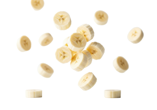 Peeled, vibrant light yellow banana slices, precisely cut, suspended mid-air in a high-key studio with a transparent background, sharp focus, motion blur. Concept of natural energy and nutrition