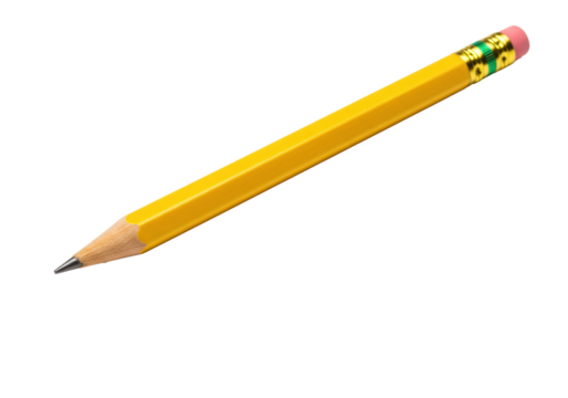 hyper-detailed macro of a brand-new hexagonal yellow pencil with green/gold ferrule and sharp graphite tip on high-key white background. concept of foundational creativity and design
