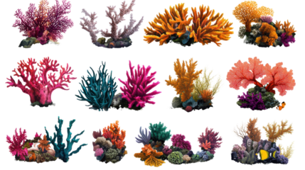 Set of vibrant coral reefs underwater marine life ecosystem isolated on white background