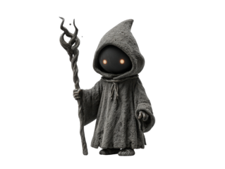 A small mysterious figure in a stone-textured hooded robe with glowing eyes holding a twisted staff.