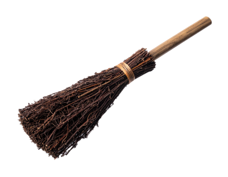 Traditional Witch Broomstick Made of Wood and Twigs Isolated on White Background