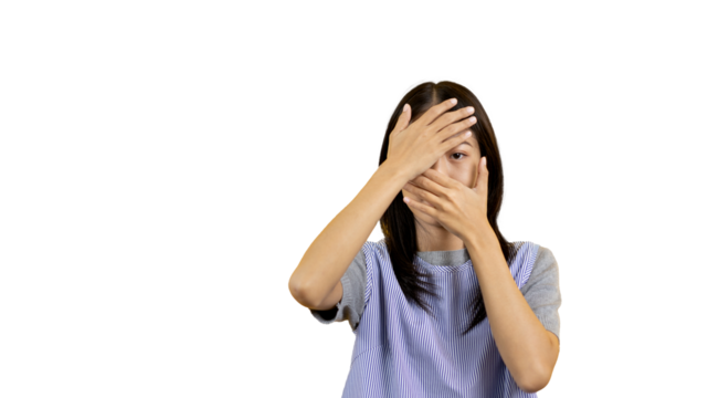 Young woman covering her face and eyes with her hands isolated, Cover your eyes with your hands for fear or prying eyes, Sneak peek, PNG file.