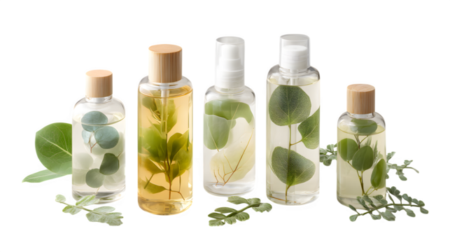 skincare bottles with botanical accents, clean product layout, white background