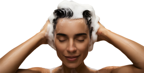 A female shampooing hair in the shower on a transparent background