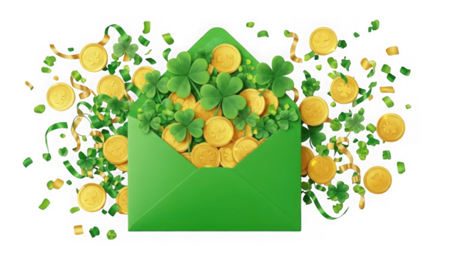 Lucky green envelope overflowing with gold coins and shamrocks isolated on transparent background