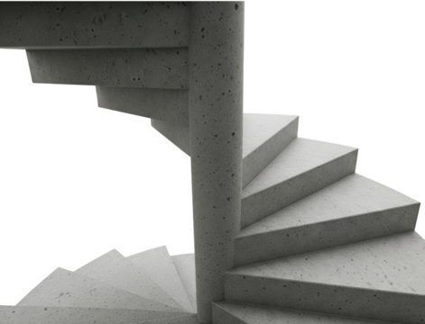 Modern concrete spiral staircase structure with architectural steps on a transparent background