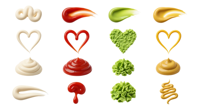Assortment of sauces and condiments in various shapes and forms on a transparent background