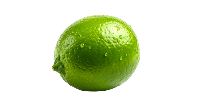 Isolated vibrant green citrus fruit with water droplets, sharp details on a black background
