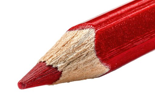 Close-up of a red colored pencil's worn tip.  The tip shows a visible, textured, light beige wood core exposed where the red coloring has worn away