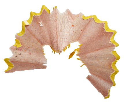 Curled yellow pencil shaving on isolated background. Close up
