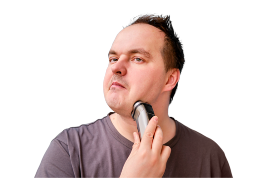 Portrait of disheveled adult man shaving stubble with electric razor, isolated on a white background