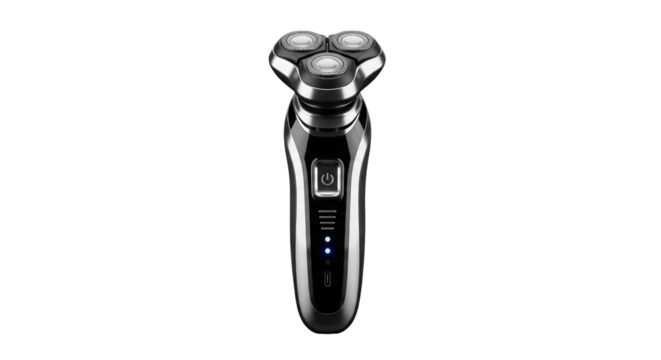 A Sleek, Silver Electric Razor With Four Rotating Blades Ready for a Close Shave on a Clear PNG or White Background.