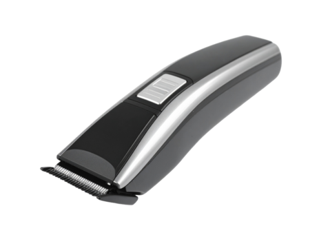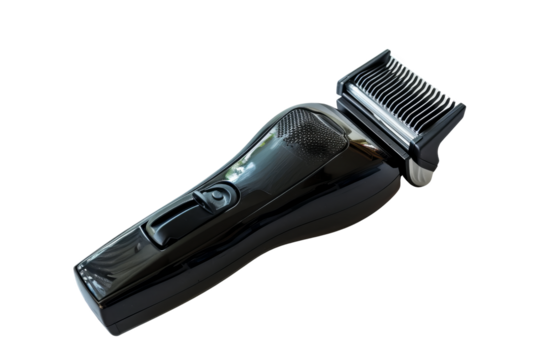 Close-up of a modern electric hair trimmer with stainless steel blades, isolated on a white background. Perfect for grooming and hair care.