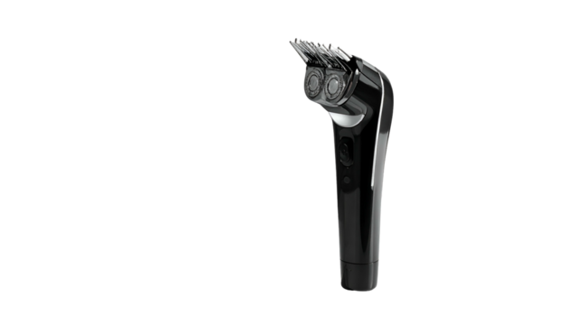 A sleek black beard trimmer, isolated on a white background, essential for male grooming.