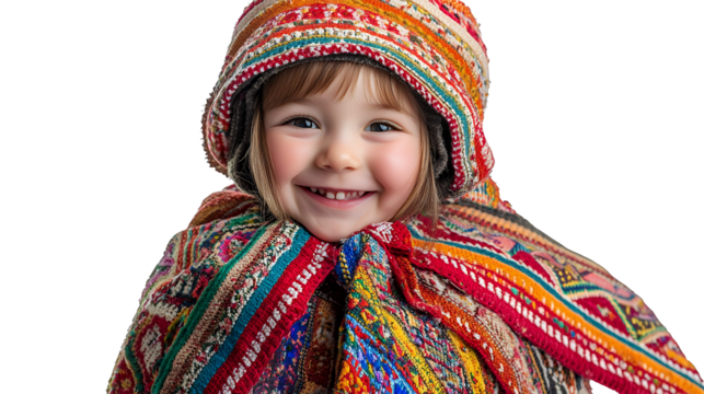 a portrait of a little girl wearing a colorful scarf, shawl and hat, with a on a transparent background, PNG image, PNG file, Generative art.
