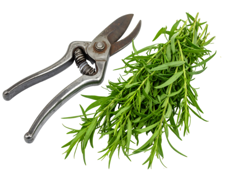 Close up view of pruning shears and fresh herb sprigs, isolated on transparent background, showing dark metallic pruning shears, light green herb sprigs, and natural light, suitable for gardening