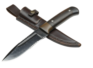 Handcrafted hunting knife in embossed brown leather sheath case on isolated background