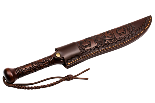 Exquisite leather sheath knife with intricate design and craftsmanship perfect for outdoor adventures and collectors, isolated a transparent background.