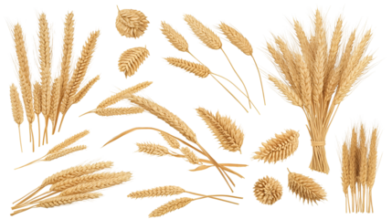 Golden wheat sheaves bundle collection. Agricultural crop harvest and grain food symbol on transparent background