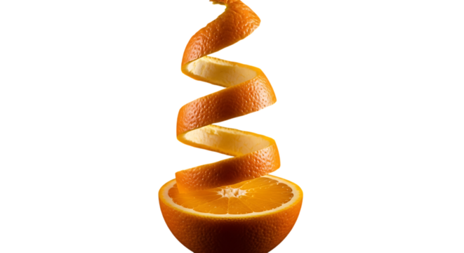 Citrus peel spiral emerging from orange fruit aromatic zest food styling close-up
