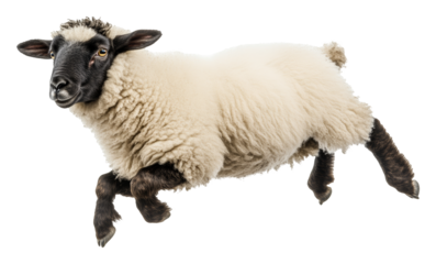 Leaping sheep with fluffy wool and black face, side view. Animal agility and nature concept