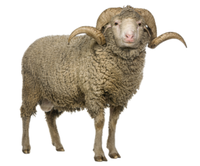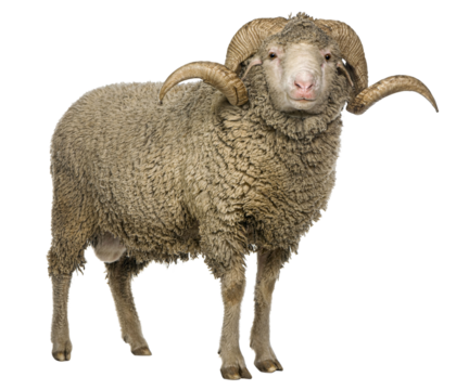 Full length view of a majestic merino sheep ram, showcasing its impressive horns and thick fleece against a transparent background