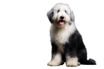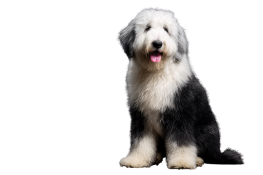 Adorable Old English Sheepdog puppy sitting, fluffy white and gray coat, pink tongue out. background removed