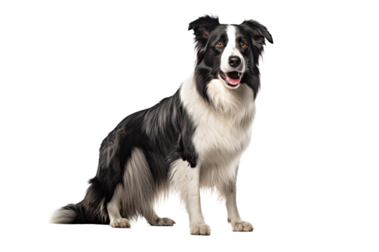 Black and white border collie sitting, isolated on white, transparent background, PNG. Portret of purebred dog, australian shepherd, pet.