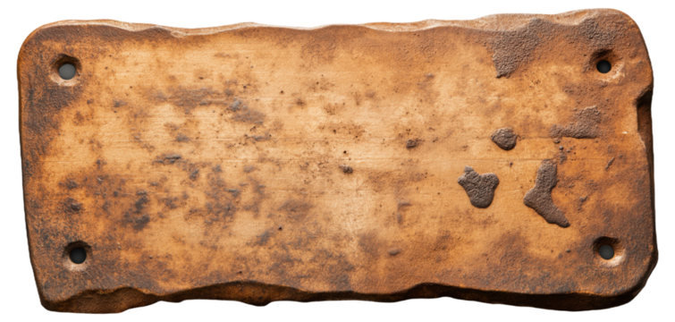 A large rectangular metal sign with rusted edges and wear marks, isolated on a Empty background.