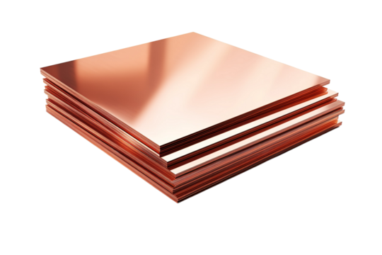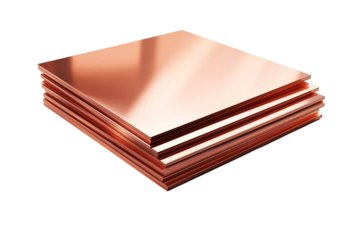 A Stack of Shiny Copper Sheets Glowing in the Light on a Clear PNG or White Background.