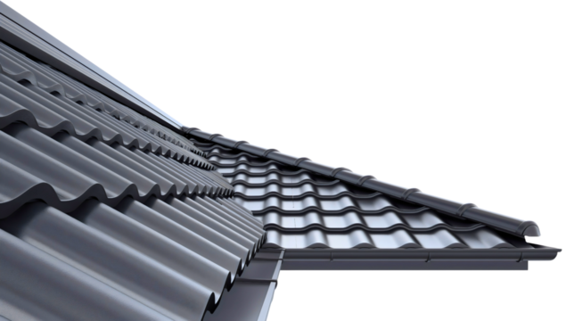 Metal dark gray or black shiny modern home or house roof tile isolated on transparent background. Roofing pattern, construction material structure, building architecture, stainless row, protection