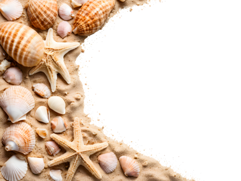 Sand and sea shells beach theme background isolated on white png image , transparent