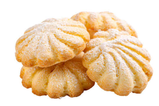 Pile of delicate shell shaped butter cookies dusted with powdered sugar