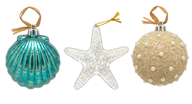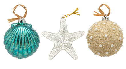 Holiday ornaments shaped like sea shells and starfish with ocean theme perfect for festive decoration