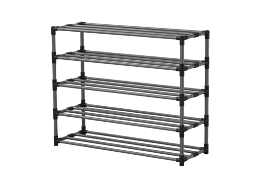 A detailed image of a simple, silver metal shelving unit against a stark black background