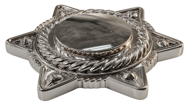 Silver police badge with golden star isolated, law enforcement emblem on transparent background in PNG format for graphic design use