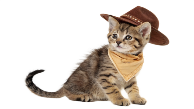 Adorable tabby kitten dressed as a cowboy with a hat and bandana